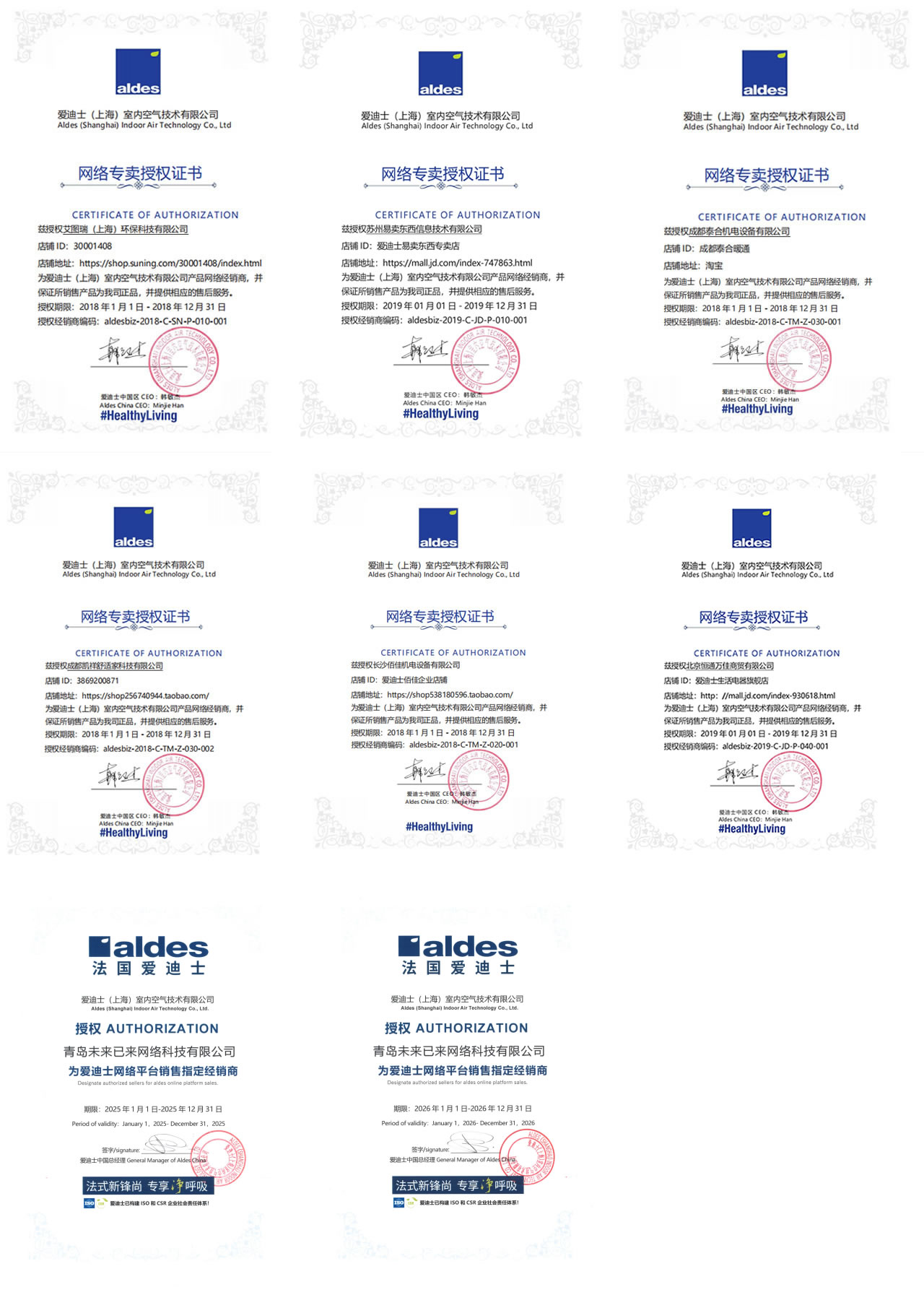 为保证爱迪士(上海)室内空气技术有限公司官网授权网络经销商的合法权益,所有网络经销商名单将公布在爱迪士官网(https://www.aldes.cn),未获得授权书或网络渠道销售本公司品牌产品的网店,不保证产品全为优质正品,爱迪士不提供相应的售后服务,且均属于侵权行为。